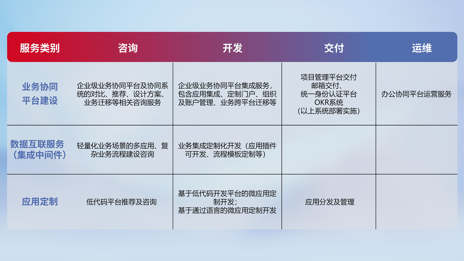 针对钉钉、、企微、、IDaas等平台级产品提供产品的规划、、、、方案、、交付、、、定制化开发等服务,,,实现如统一协同办公、、、智能客户服务、、、、混合会议管理、、、、智能数据查询、、等业务场景,,,实现数字化转型。。